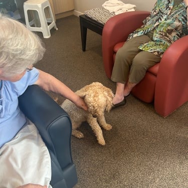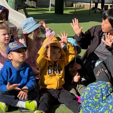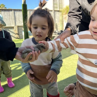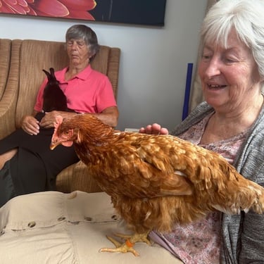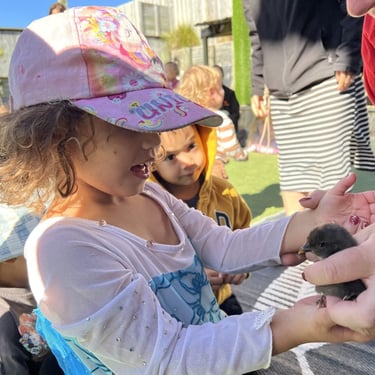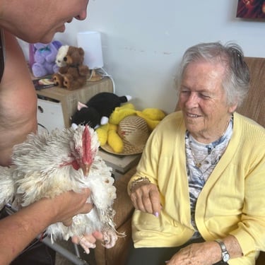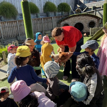 We visited Hand and Hand on 20 March 2025. The animals that visited were: Piper (Miniature Poodle x Lagotto Romagnolo dog); Easter (Mini Lop bunny); Marshmallow (XBred bunny); Ace (Rex bunny) Fudge (Mini Lop bunny); Henny (bantam X hen); Goldie (Brown shaver hen); baby chicks.